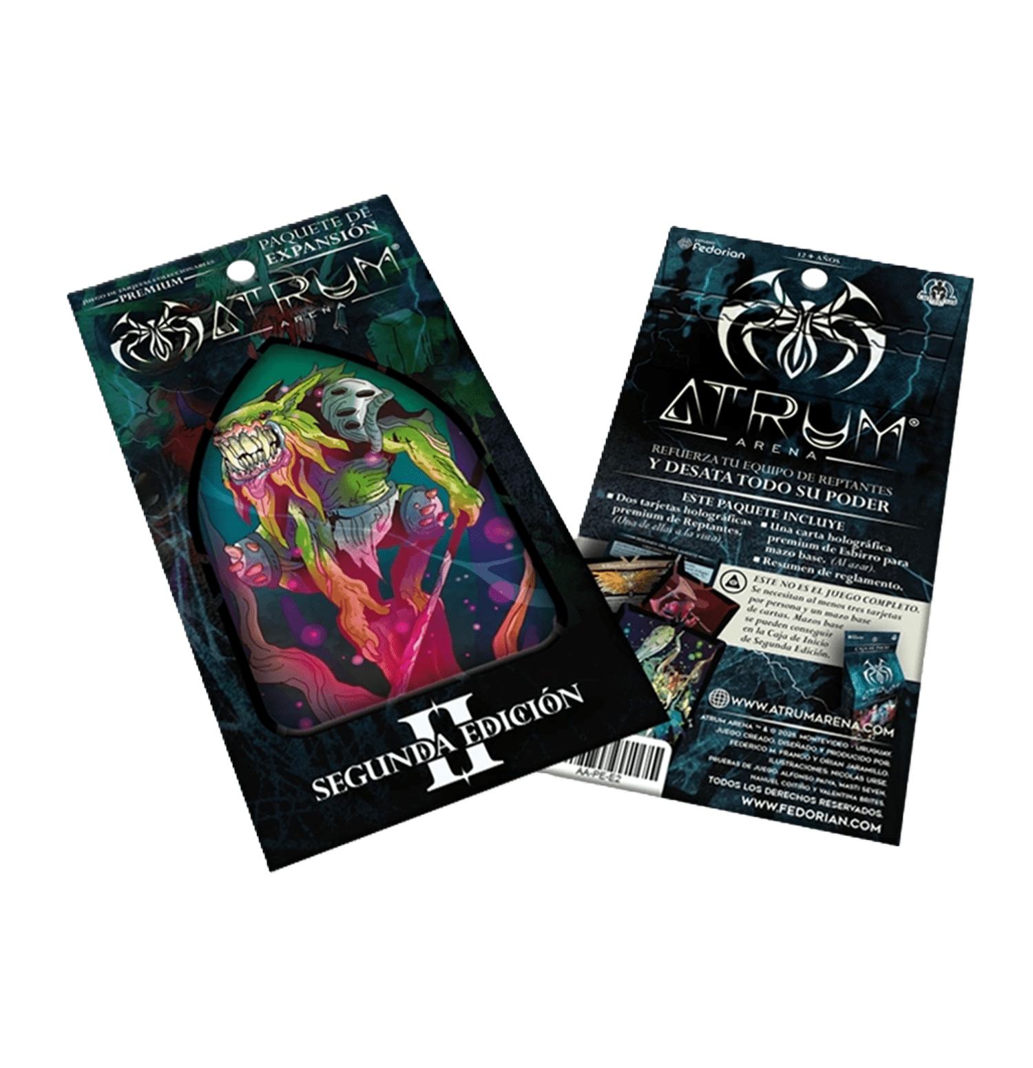 • 2 tarjetas premium holográficas de Reptantes. Una de las tarjetas está totalmente a la vista para que puedas elegirla. La segunda es al azar.