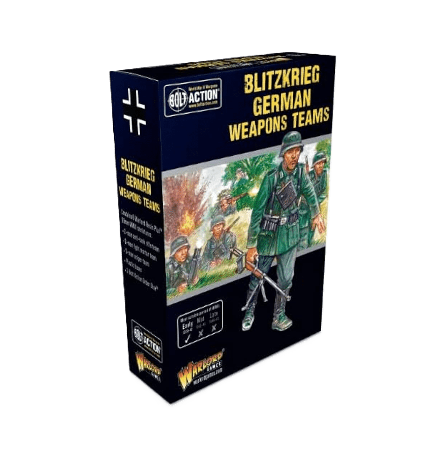 Contiene tres dados de orden de acción de perno y las siguientes miniaturas de resina de señor de la guerra del ejército alemán de la guerra temprana
