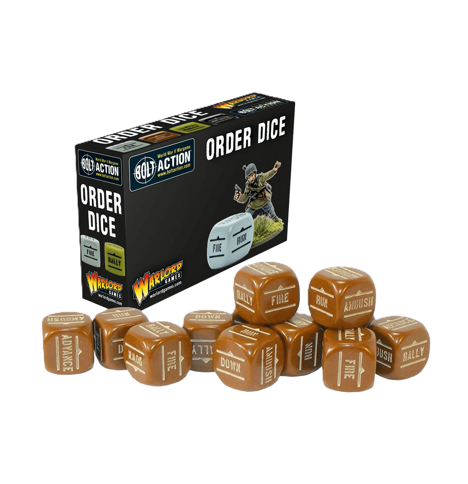 Bolt Action utiliza un sistema de activación aleatoria de unidades mediante dados de órdenes. Cada jugador necesitará un juego de dados de órdenes de un color distinto al de su oponente.