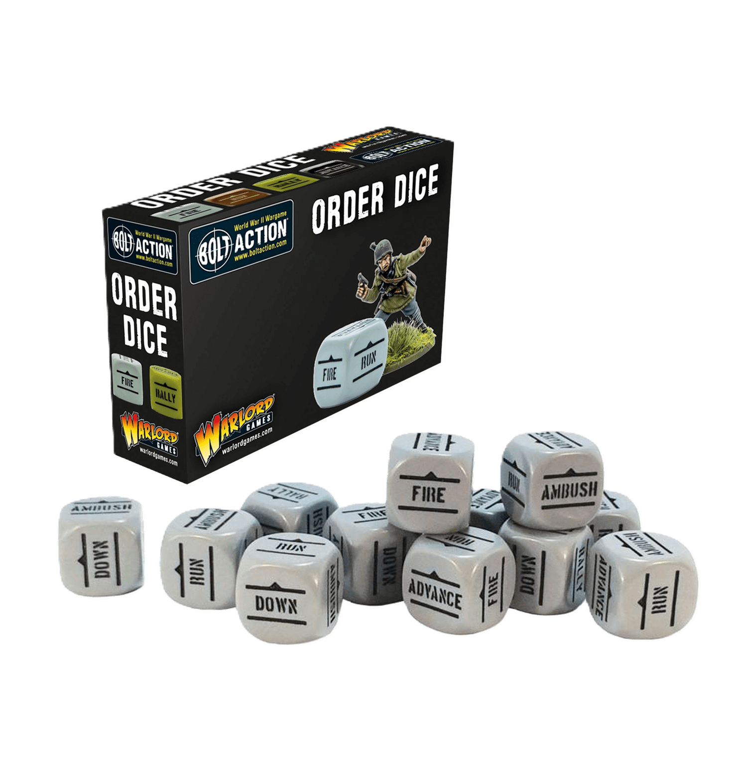 Bolt Action utiliza un sistema de activación aleatoria de unidades mediante dados de órdenes. Cada jugador necesitará un juego de dados de órdenes de un color distinto al de su oponente.