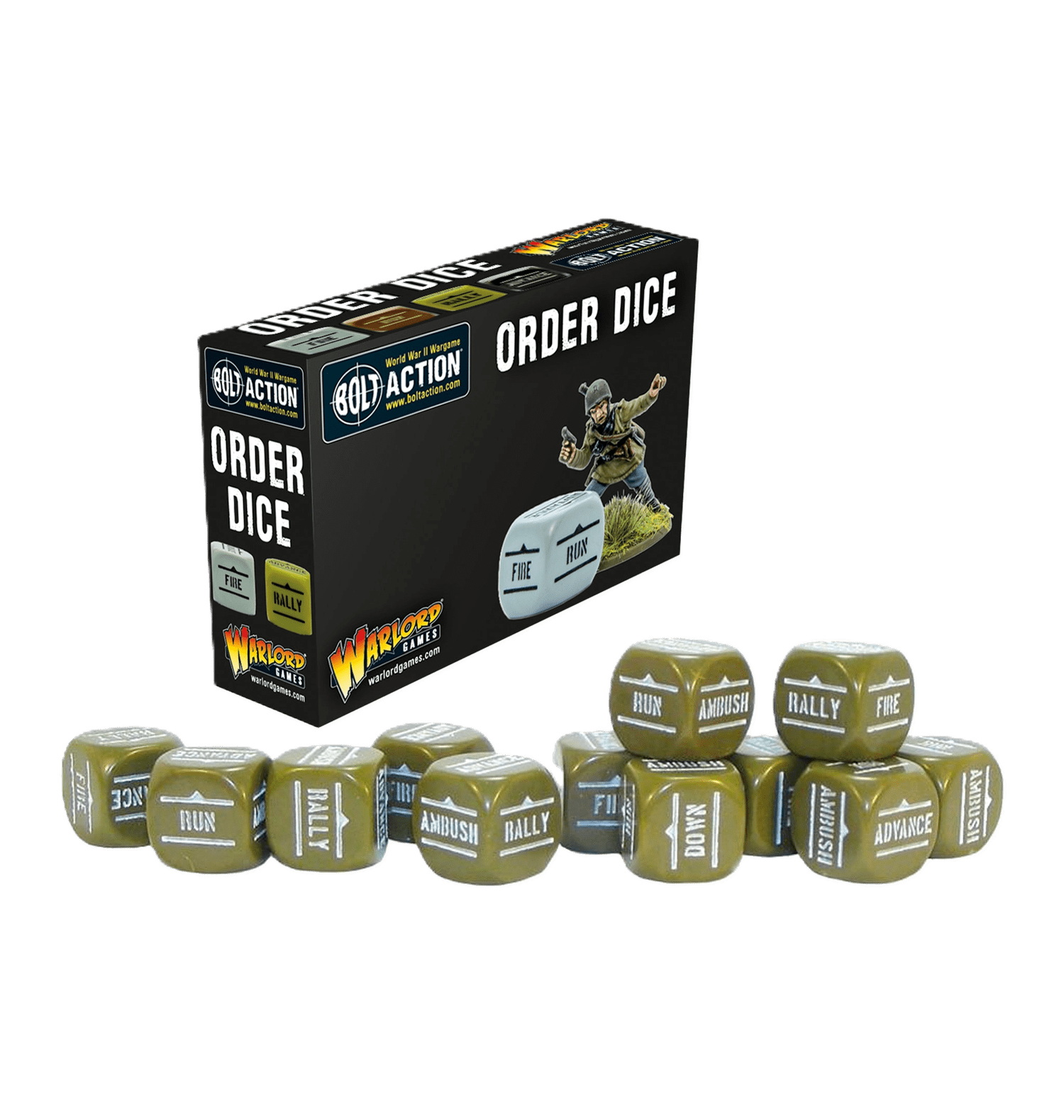 Bolt Action utiliza un sistema de activación aleatoria de unidades mediante dados de órdenes. Cada jugador necesitará un juego de dados de órdenes de un color distinto al de su oponente.