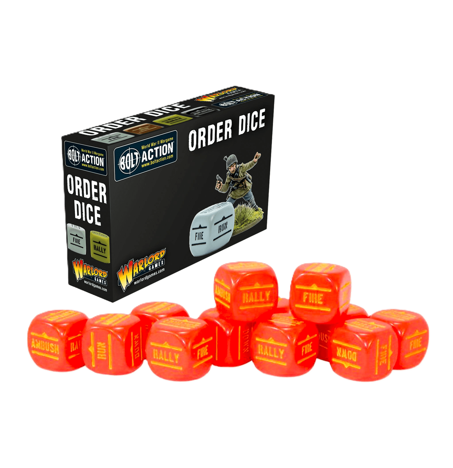 Bolt Action utiliza un sistema de activación aleatoria de unidades mediante dados de órdenes. Cada jugador necesitará un juego de dados de órdenes de un color distinto al de su oponente.