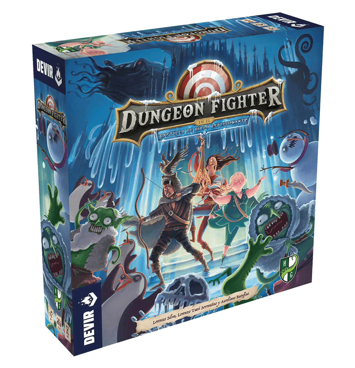 En “Dungeon Fighter: Castillo de Hielo Espeluznante” nuestros héroes se deslizan por los helados pasillos del castillo de hielo espeluznante, ¡una gélida fortaleza en la que corren el riesgo constante de caer en un infierno helado! ¡Con dados de cuatro caras superdeslizantes y un tablero de objetivos de temática cuadrada para vivir una escalofriante aventura de Dungeon Fighter!