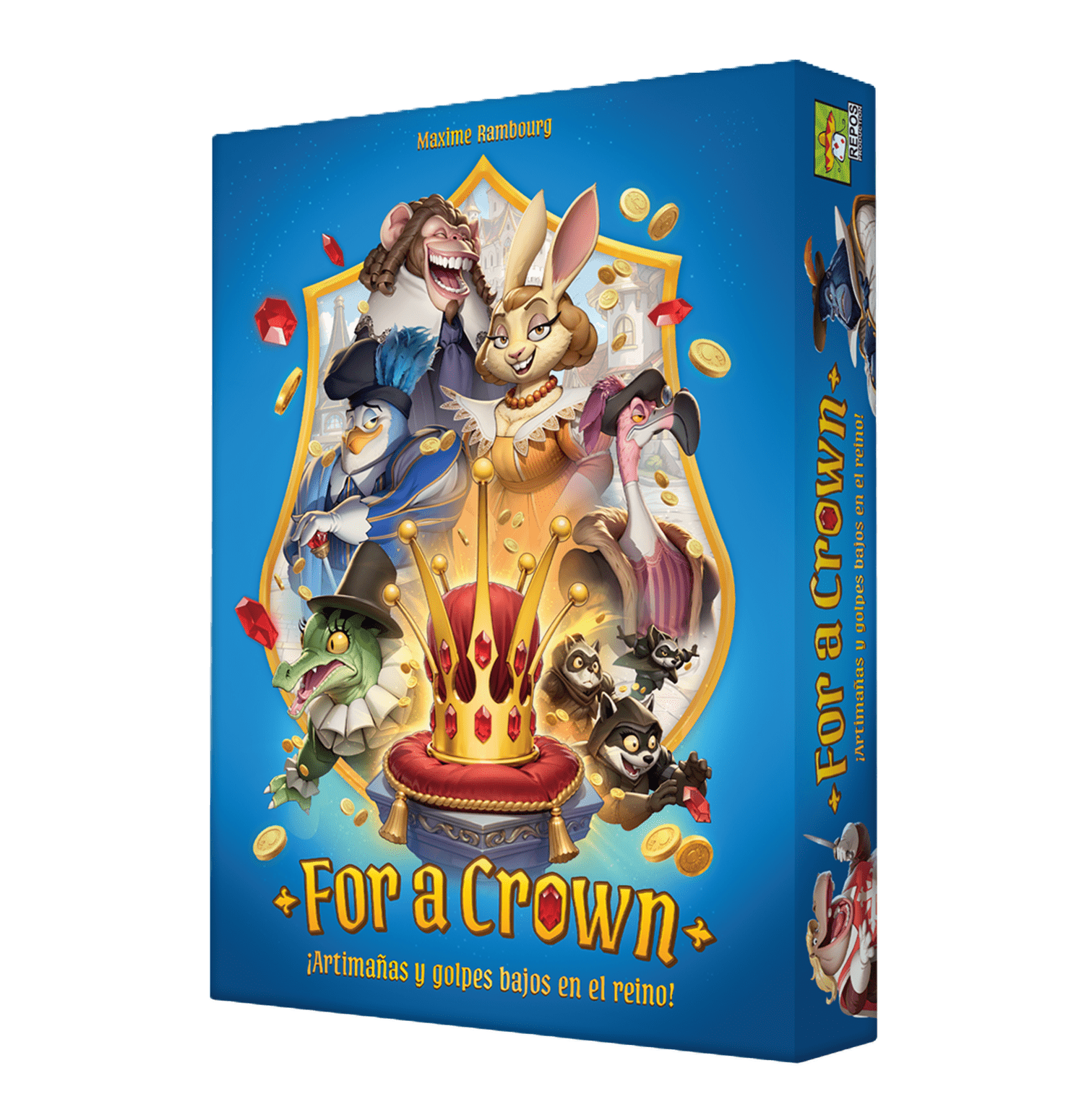 “For a Crown” es un juego de mesa, de construcción de mazos, con un único mazo. Los jugadores reclutan nuevos personajes, como mercenarios, y colocan estas cartas dentro de una funda de su propio color.