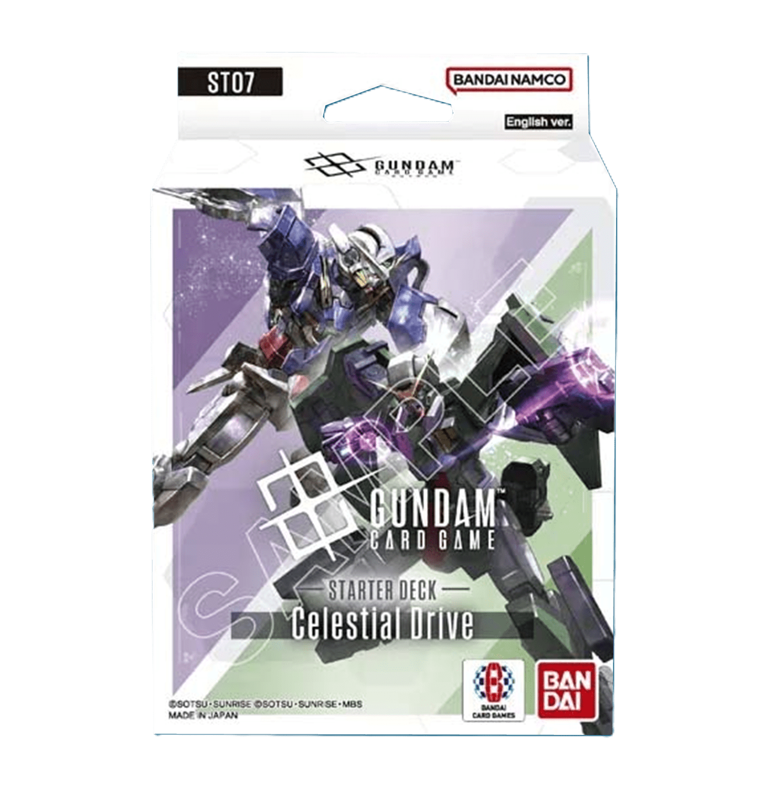 ¡Comienza la Intervención Celestial! El “Starter Deck [ST07]: Celestial Drive trae a los legendarios Gundam Meisters de Mobile Suit Gundam 00 al campo de batalla. Este mazo listo para jugar te pone al mando de Setsuna F. Seiei, Lockon Stratos y todo el equipo de Celestial Being. Es ideal para jugadores que disfrutan del control del campo, los ataques de precisión y el combate técnico.