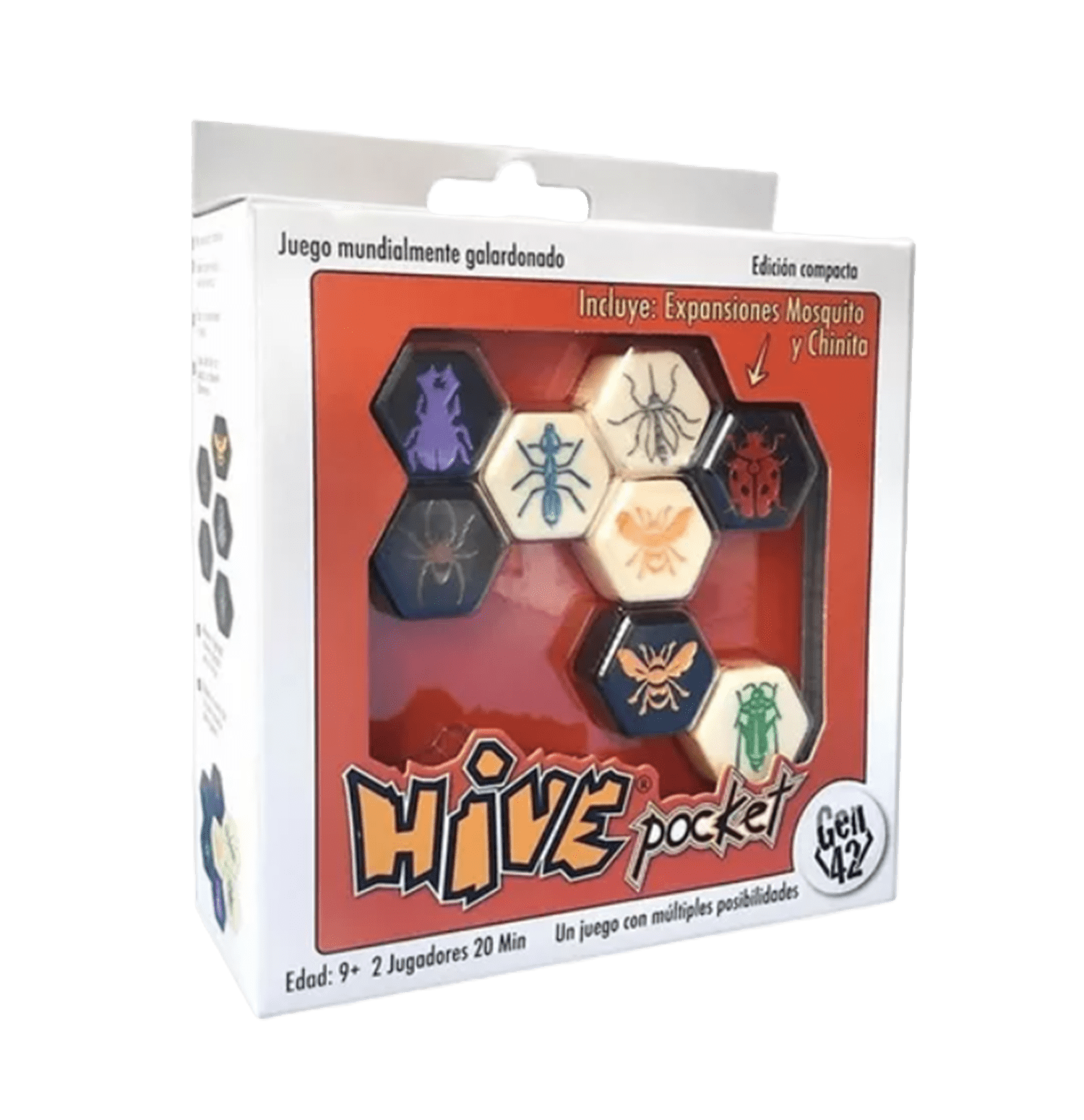 “Hive Pocket” es la versión de bolsillo de “Hive”. En esta edición las fichas tienen un diámetro de 25mm y 10mm de alto. Además se incluyen las mini expansiones “Hive: The Mosquito” y “Hive: The Ladybug”.