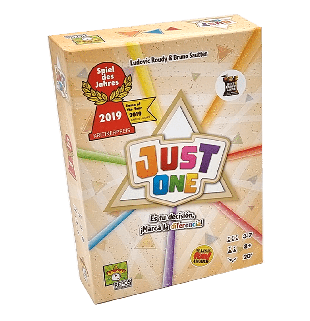 “Just One” es un juego cooperativo de adivinanzas para entre 4 y 7 jugadores. Su misión es averiguar cuantas más palabras secretas mejor, antes de que se acaben las cartas del mazo. Un divertido juego perfecto para toda la familia y que supone una manera divertida de mejorar habilidades como la deducción lógica y herramientas como el vocabulario, la capacidad de expresión y la síntesis.