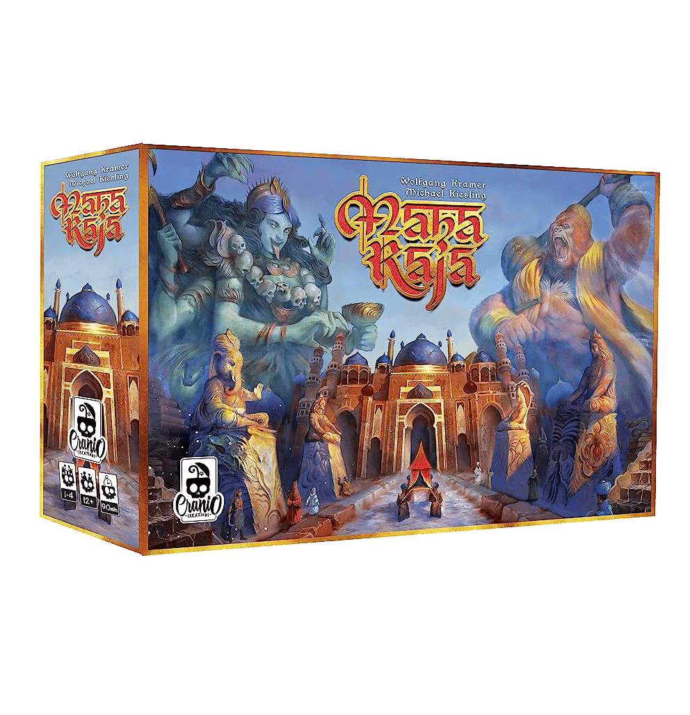 “Maharajá” es un juego de mesa estratégico, de control de áreas. Elige una gran deidad hindú entre cuatro disponibles, ponte las vestiduras de su sacerdote y viaja por el reino para construir altares y estatuas consagradas a ella. Planifica en secreto tu estrategia e intenta derrotar a tus oponentes con la ayuda de personajes y sus habilidades.
