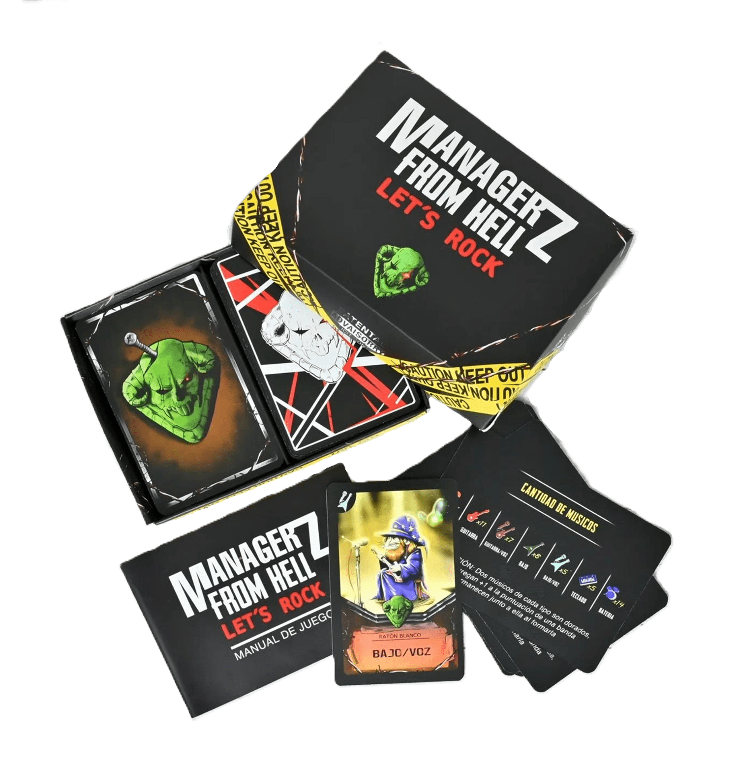 “Managerz From Hell” es un juego de cartas competitivo de entre 2 a 5 jugadores. El objetivo del juego es formar bandas para conseguir puntos y formar bandas se necesitan músicos. Hay 7 tipos diferentes. Podrás usar cartas de efecto para beneficiarte o perjudicar al resto. Es poible negociar para intercambiar un músico por otro que necesites.