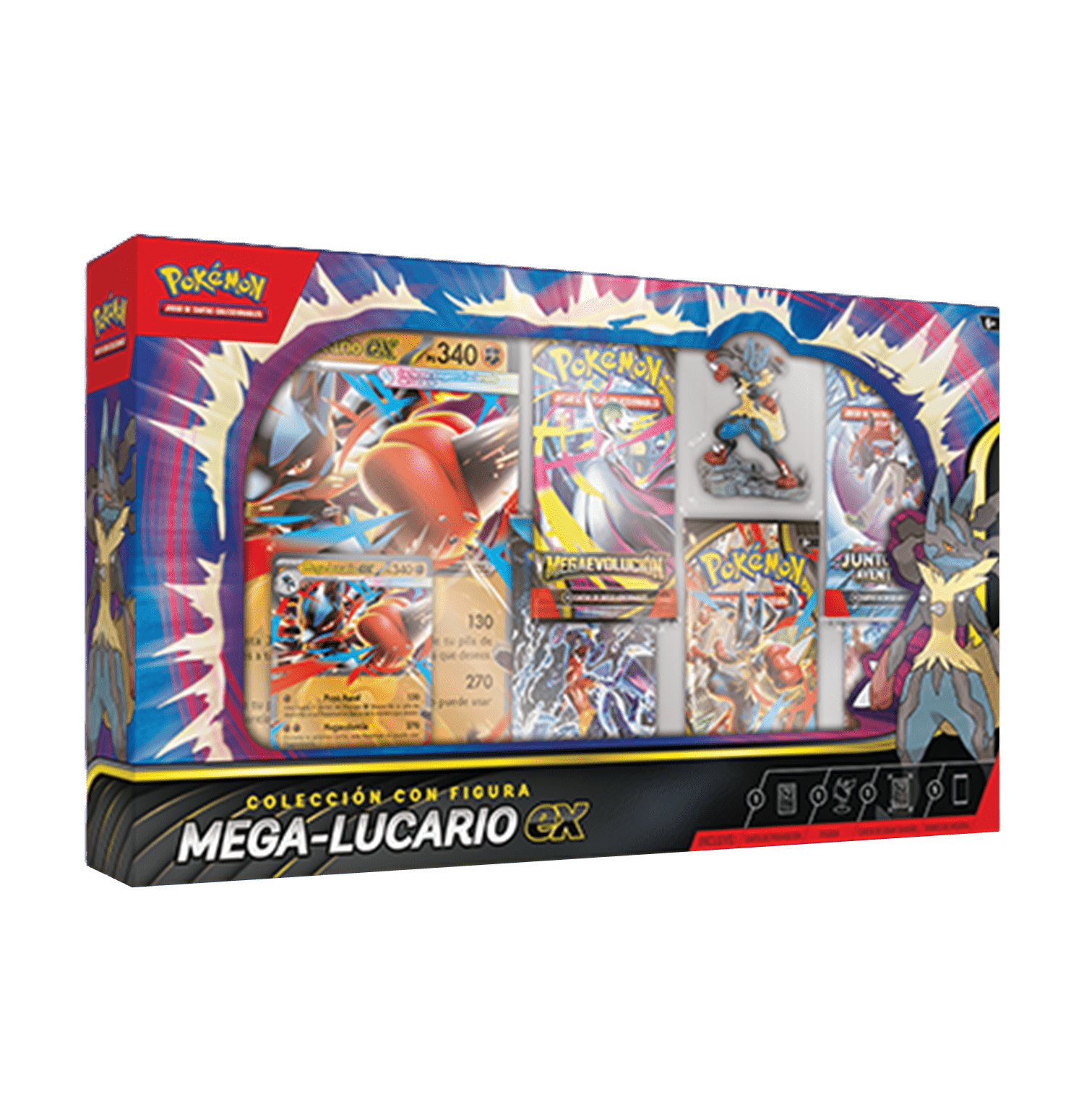 Mega-Lucario ex doblega a sus rivales y reparte la Energía descartada entre los Pokémon en Banca. Desata el inmenso poder del Pokémon Aura con una carta promo holográfica lista para jugar, una carta promo jumbo y una detallada figura que muestra a Mega-Lucario en acción. También encontrarás otros muchos poderosos Pokémon que incorporar como aliados en los sobres de refuerzo.