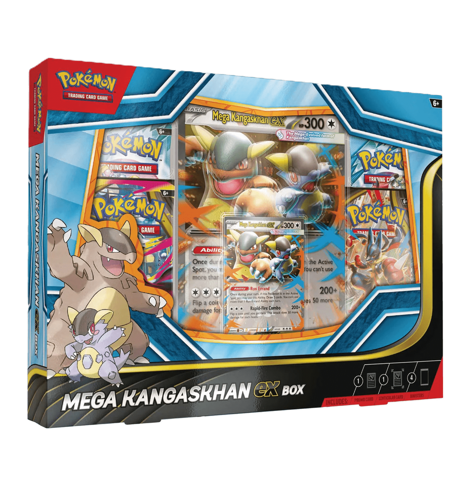 ¡Lanza un Combo Ráfaga con Mega-Kangaskhan ex! La Megaevolución ha convertido a la cría de Kangaskhan en una fuerza imparable, ¡y los dos juntos combinarán sus poderes como Mega-Kangaskhan ex para robar cartas extra con Recado e intentar infligir todavía más daño lanzando monedas con Combo Ráfaga! Une tus fuerzas a Mega-Kangaskhan ex, que llega en forma de carta holográfica de promoción lista para jugar y en versión de gran tamaño con efecto 3D, ¡y encuentra otras increíbles cartas en los cuatro sobres de mejora incluidos!