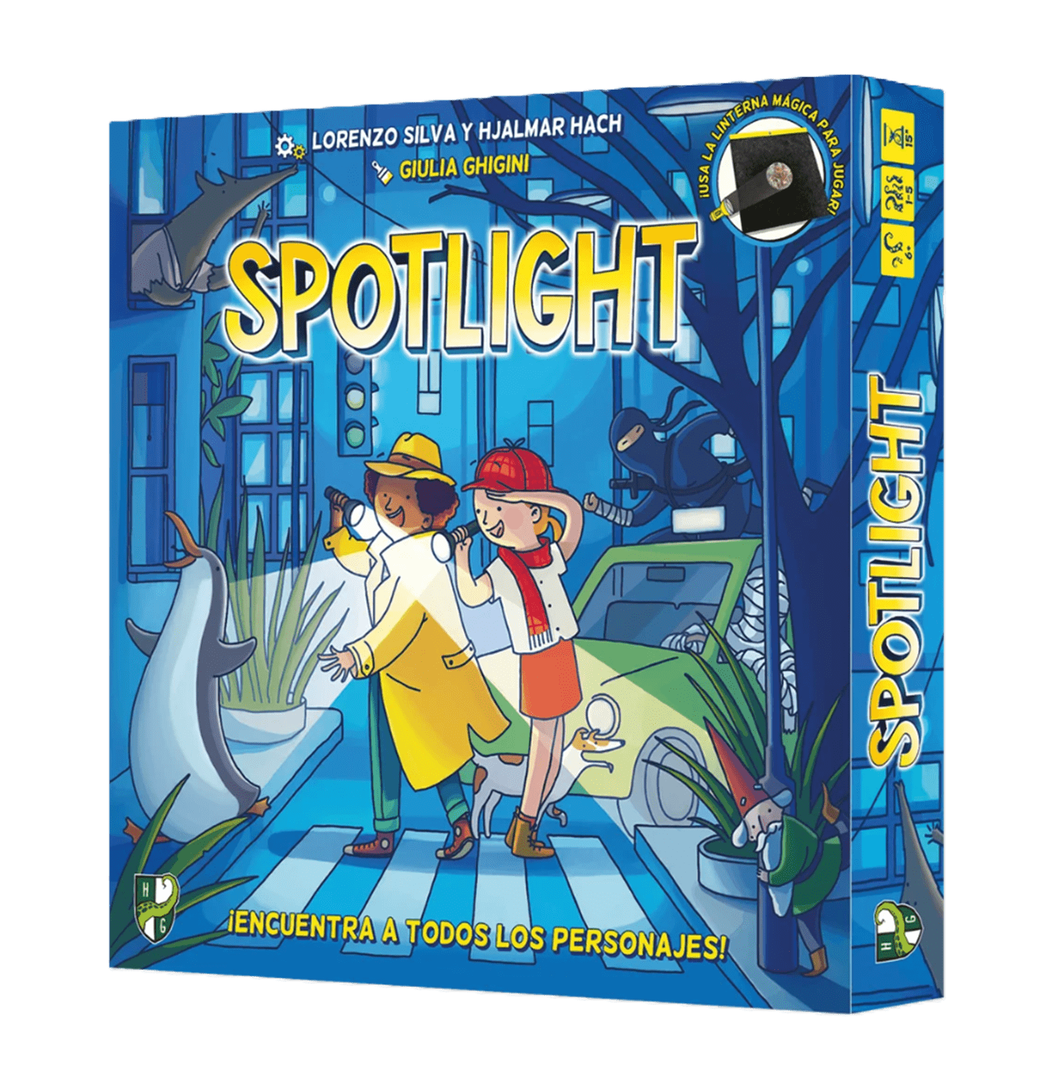 “Spotlight” es un juego de mesa cooperativo, de objetos ocultos, en el que tú y tus amigos buscáis con vuestra confiable linterna personajes y objetos extravagantes escondidos en lugares oscuros llenos de cosas absurdas. Tu objetivo es encontrar tantos como sea posible para avanzar tus peones en el tablero y cruzar la línea de meta, sin que ningún jugador sea alcanzado por el peón de la luna que los persigue.