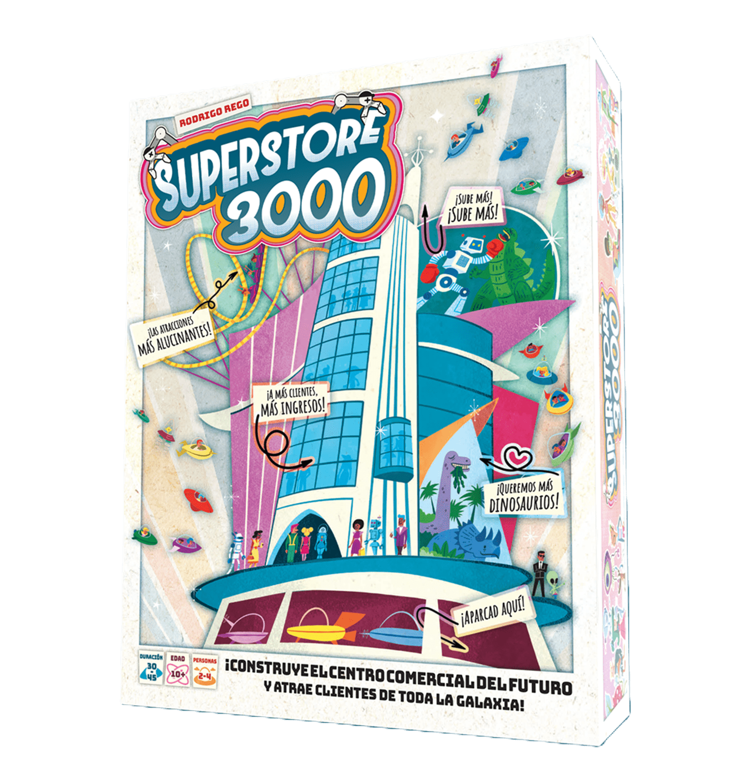 Bienvenido a “Superstore 3000”, el juego de mesa retro-futurista, de construcción de centros comerciales, en el que debes construir el centro comercial más alto e increíble para satisfacer a la mayor cantidad de clientes posible.