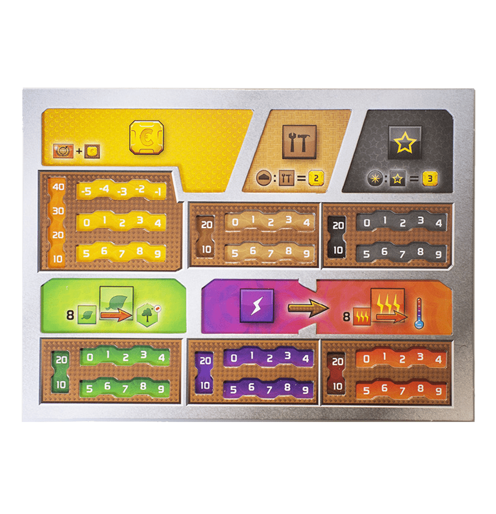 Fabricados a doble cara, su diseño permite que los cubos de recursos y los indicadores del nivel de producción de los mismos no se muevan del tablero ante cualquier golpe o movimiento inesperado de los jugadores.