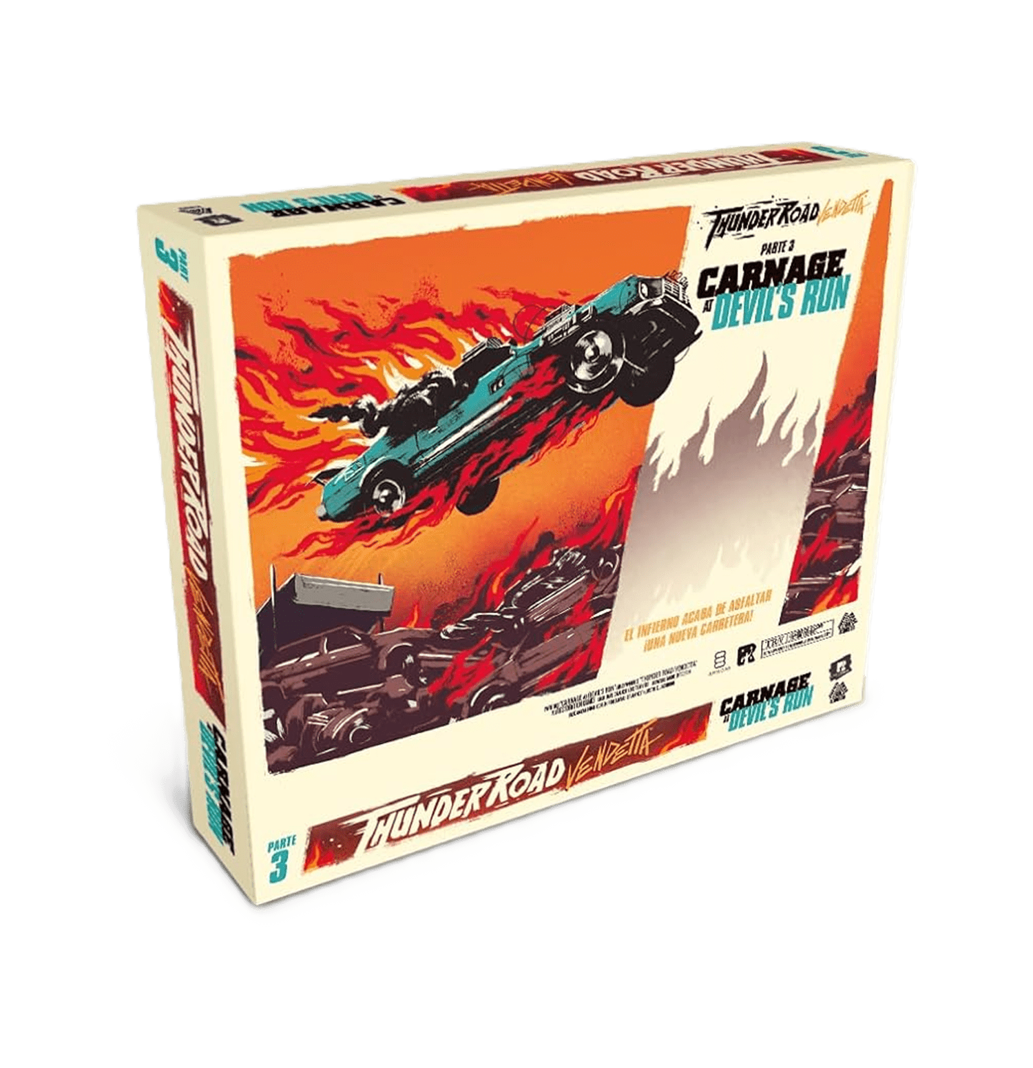 Esta expansión “Thunder Road: Vendetta – Carnage at Devil’s Run”, para el juego de mesa Thunder Road: Vendetta, añade nuevos tableros de carretera al juego base, con terrenos peligrosos, daño continuo, nuevos efectos de daño… ¡y fuego!
