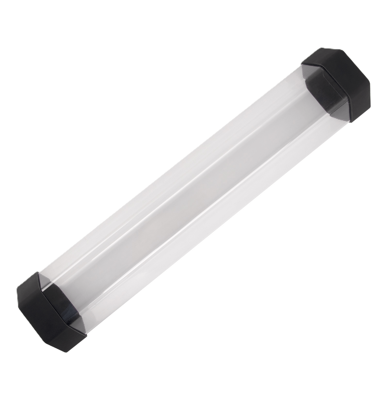 Tubo transparente para transportar y guardar playmats, con base hexagonal.