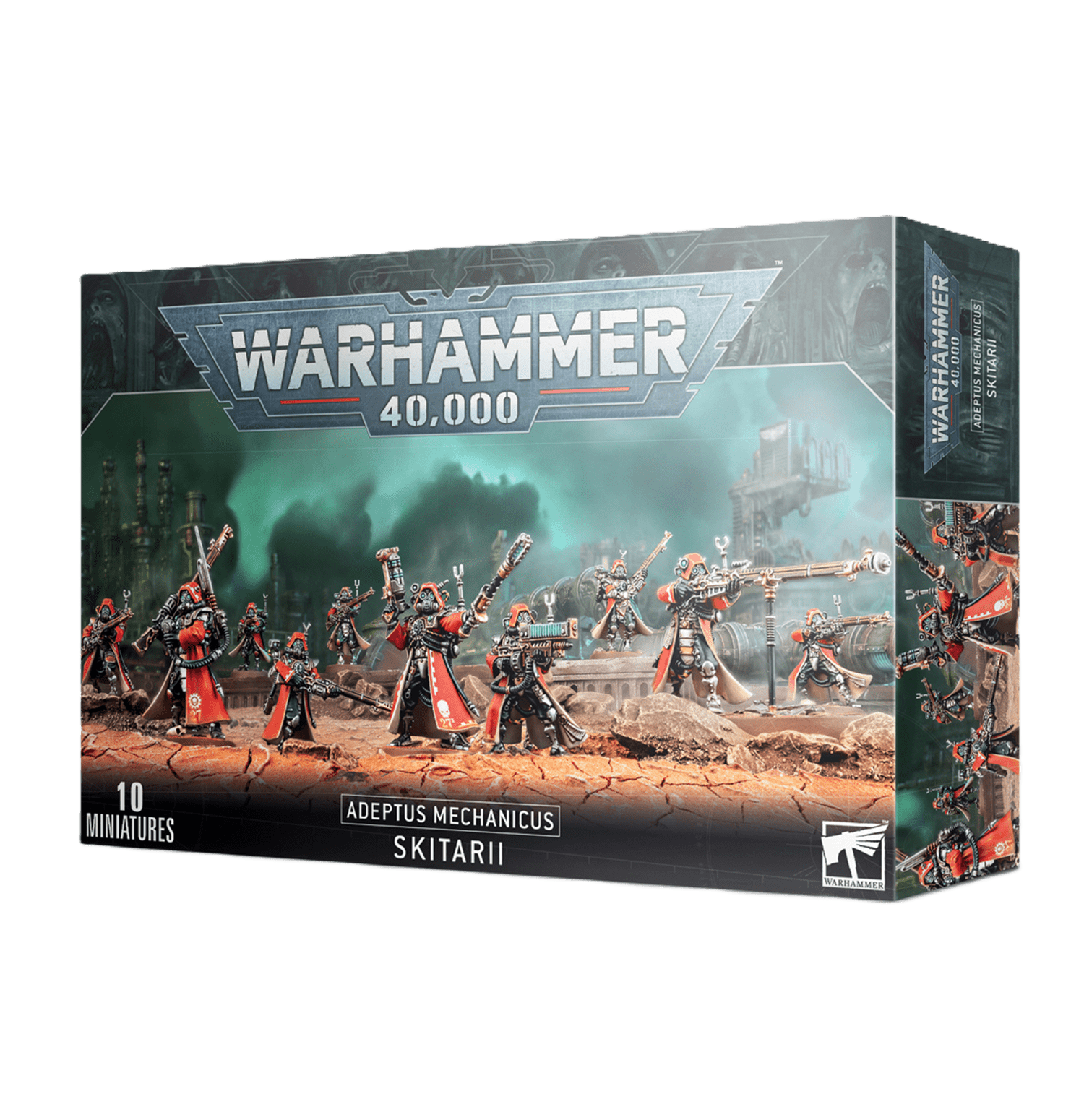 Esta caja de plástico multicomponente contiene todo lo que necesitas para montar diez Skitarii Rangers o diez Skitarii Vanguard. En la caja se incluyen 124 componentes: veintitrés cabezas, doce de las cuales son variantes de yelmo/respirador Vanguard, veinticinco armas, una hoja de calcomanías, una peana ovalada de 60×35.5mm y diez peanas redondas de 25mm.