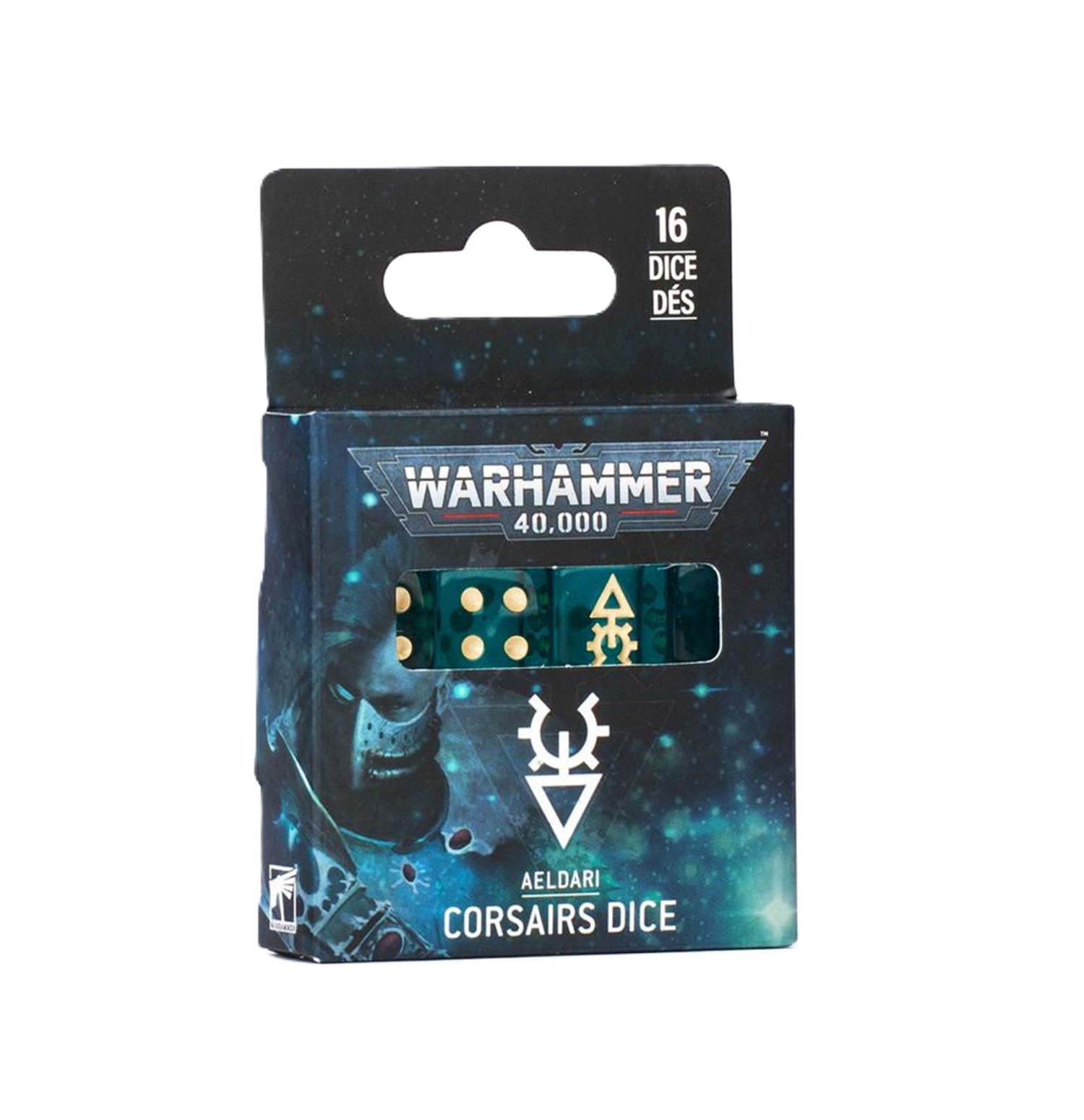 Este es un juego de 16 dados de seis caras con bordes cuadrados para usar en partidas de Warhammer 40,000, inspirados en los Corsarios Aeldari. Están fabricados en plástico acrílico color turquesa con efecto de gema y marcas de tinta crema, y miden 16 mm por cada lado. Las caras del 1 al 5 tienen el tradicional punto, y cada cara del ‘6’ está decorada con el icono pirata de los Corsarios Aeldari.