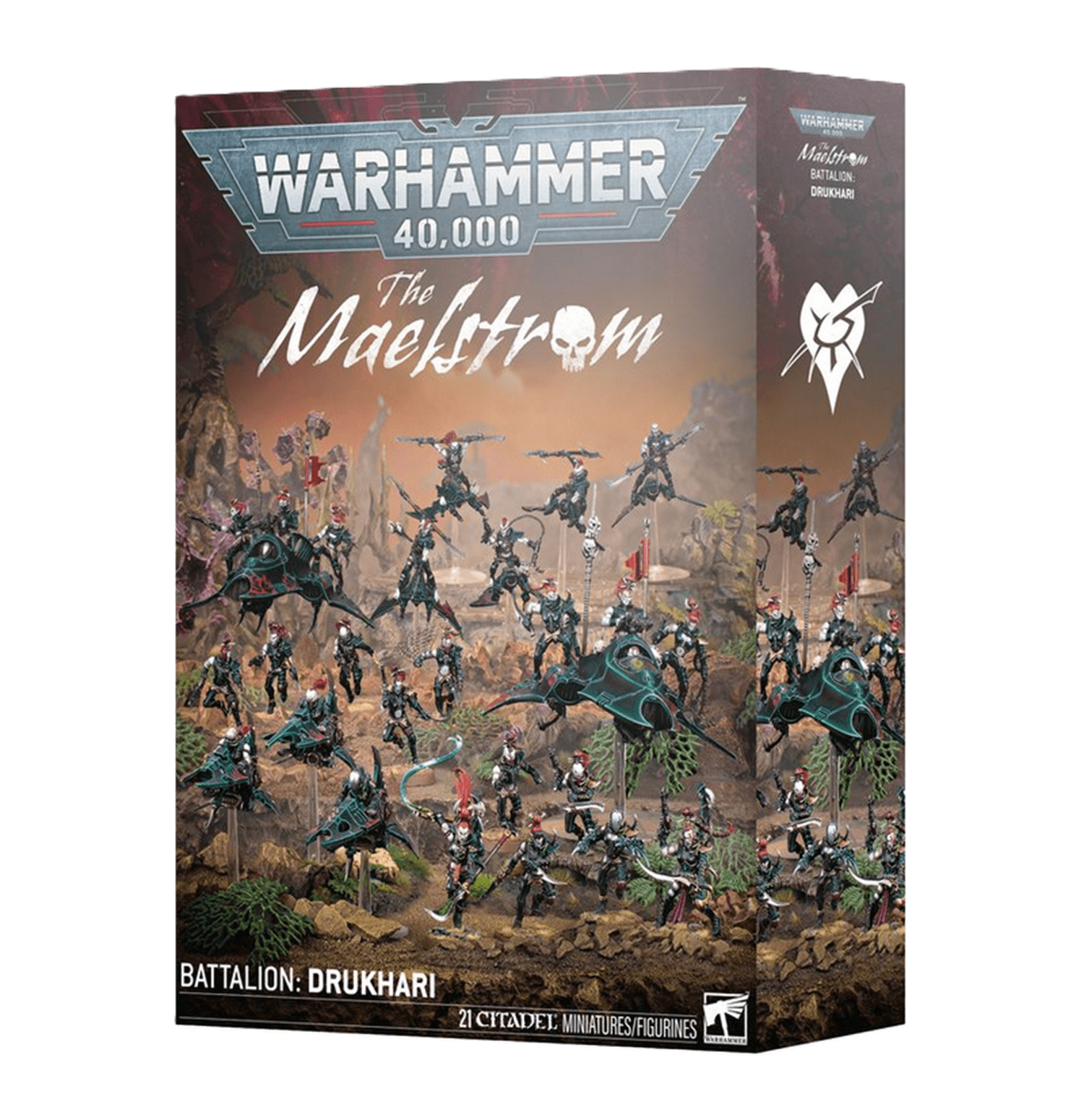 “The Maelstrom Battalion: Drukhari” es una caja imprescindible para los jugadores que desean desplegar la brutal velocidad, elegancia letal y sadismo característico de los saqueadores de Commorragh en Warhammer 40000. Este pack de miniaturas reúne una fuerza temática perfecta para ejecutar rápidas incursiones piratas, capturar prisioneros y sembrar el terror en el campo de batalla, representando el estilo agresivo y espectacular del Culto de Brujas.