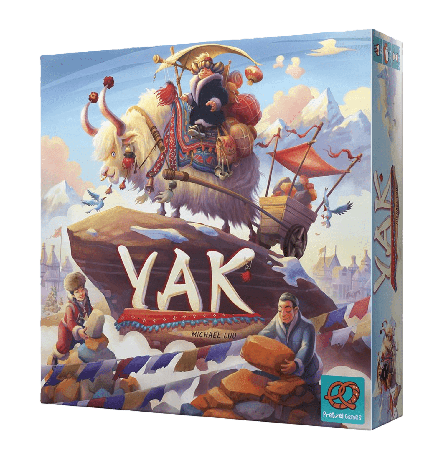 “Yak” es un juego de mesa en el que el anciano de la aldea te ha encomendado la tarea de construir una gran torre de piedra para guiar a los mercaderes y sus yaks en el Himalaya. Cada turno, un yak tira de su carro hacia tu aldea. ¿Podrás encontrar las piedras necesarias y la comida para tus reservas? ¿O tendrás que darte una vuelta por el mercado para encontrar lo que necesitas?